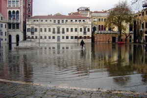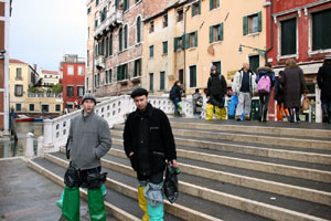 К тому моменту, когда мы добрались до центральной площади, Сен Марко, она была ещё затоплена, но уже можно было перемещаться по временным мосткам и, в общем, вода спадала, так что народ ещё немного побродил, пофотографировался в своих колоритных бахилах – и постепенно стал заполнять ими близлежащие урны. Василий Иванович сделал это последним. Обратно шли налегке.
